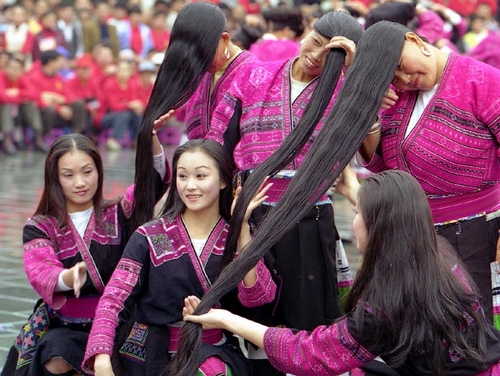 In Huangluoyao Village, there live about 60 Hongyao families. About more than 80 Hongyao women out of 120 keep their hair longer than 1.4 meters, with the longest hair as long as 1.8 meter. The group has been listed by Guinness World Record as the “longest hair group”. Each Hongyao woman has three tufts of hair, except for the first tuft grown on the head, they keep the second tuft cut at their eighteenth and the third tuft collected daily when they do up their hair. The three tuft of hair must be bound in the head every day.
